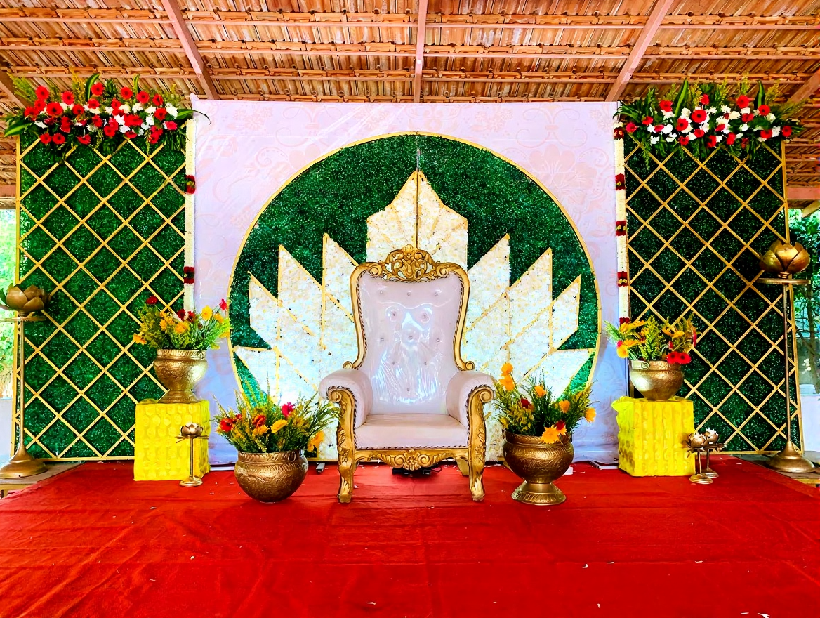 Perfect for farmhouse venues, banquet halls, resort events, and spacious home celebrations across Bangalore, this décor brings together heritage aesthetics with premium finishing.
